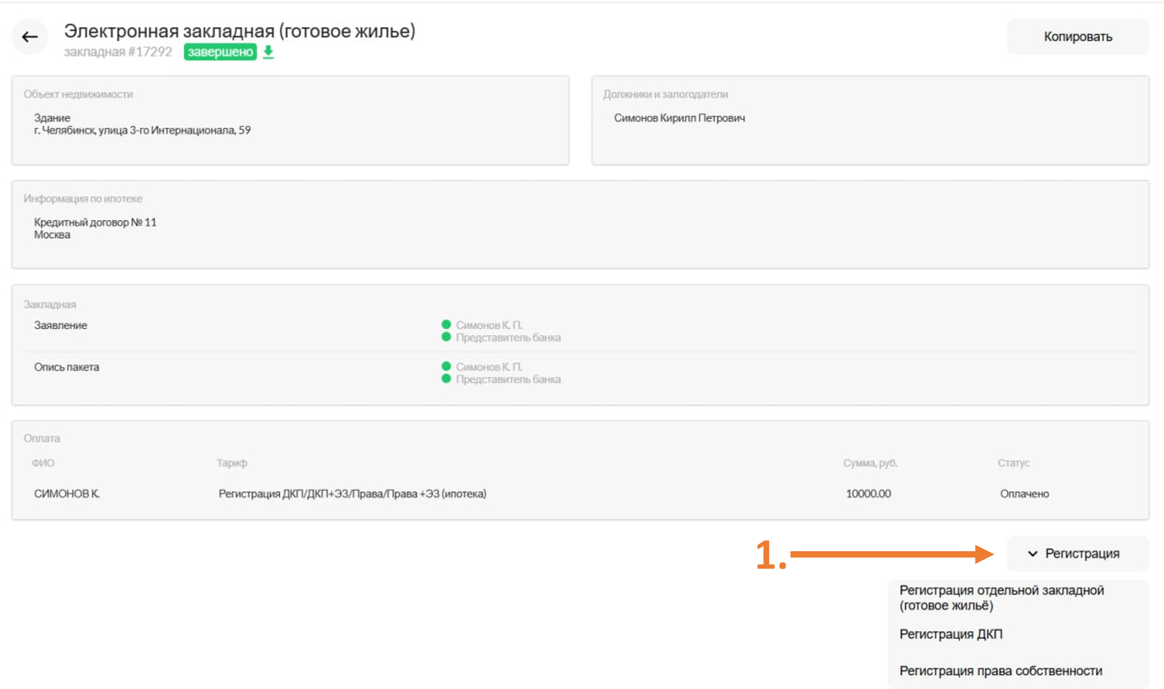 2. Если это регистрация отдельной закладной, то вы сможете привязать оплату из любой сделки, которая включает в себя регистрацию закладной.