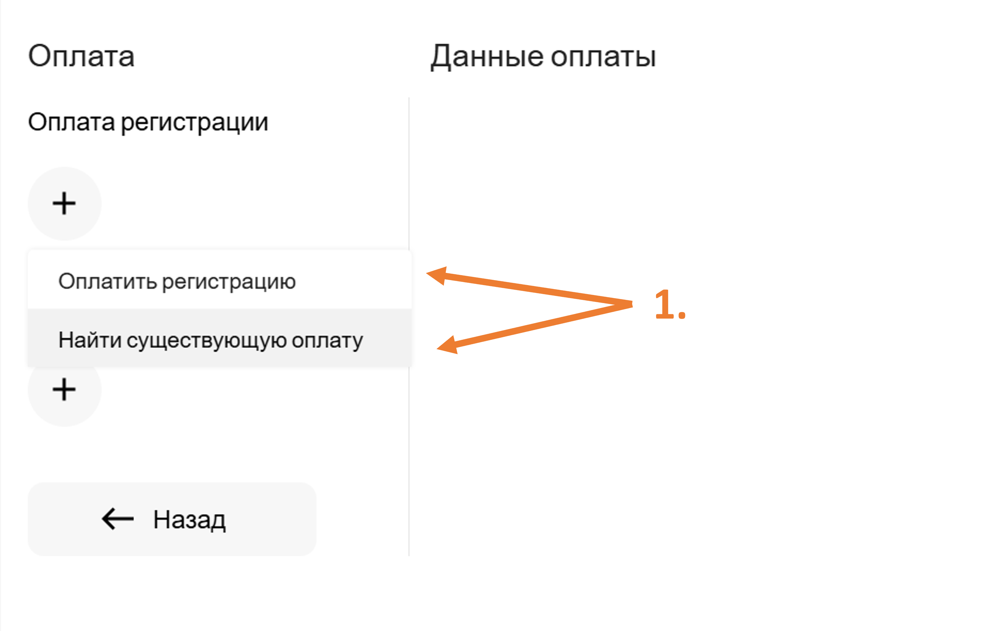 Появятся две опции: Оплатить регистрацию и Найти существующую оплату (подробнее о второй опции будет дальше).