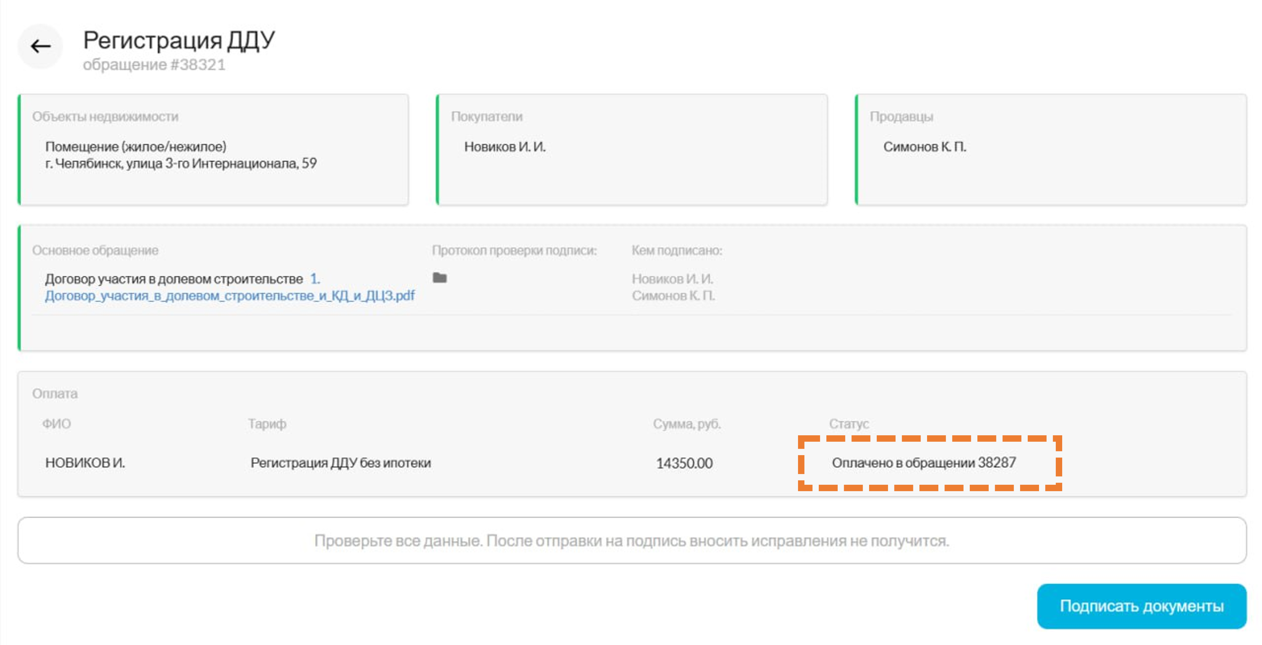 Опция отправки документов на подписание разблокируется после верного заполнения всех разделов обращения. (1)